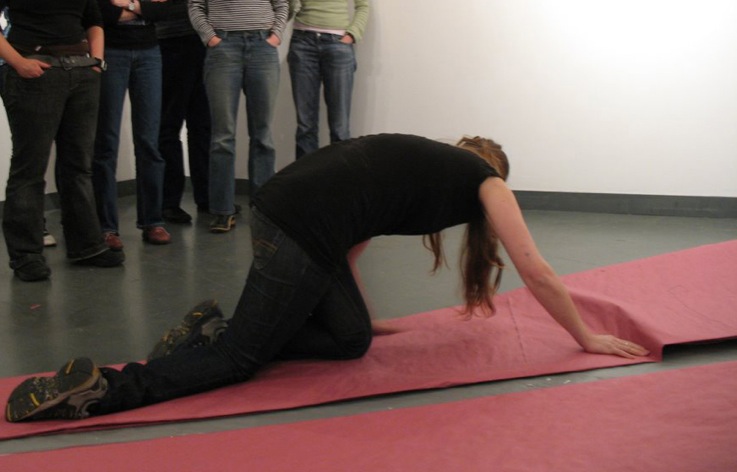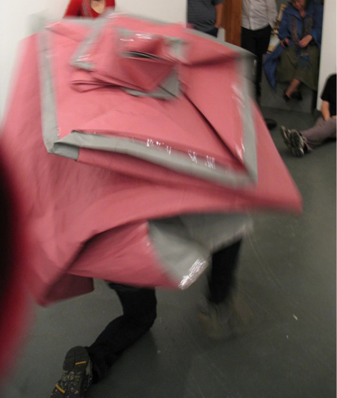 The crowd gathers and stands around in the gallery. The gallery floor is covered in thick gray paper, wall to wall. The crowd is standing on top of it. The doors are closed. I start lift one side of the paper floor and fold it onto itself, and then grab another side and fold that onto itself. The folding of the paper makes the crowd have to move out of the way, and I herd them as I fold, around the gallery room. I keep folding the paper, which is bright pink on the bottom of it. I am using an origami folding pattern I designed to fold into a snail shell. I complete the origami snail shell made from the gallery floor, put on top of me and walk out the door, out of the gallery, and to my hotel room.