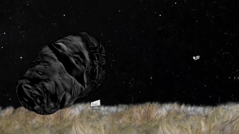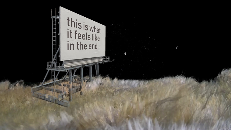 sighs2019 Virtual Reality experience with original music, made for stand alone VR headsets. Viewers travel through a miniature landscape with large asteroids flying overhead. They encounter billboards with poetry.