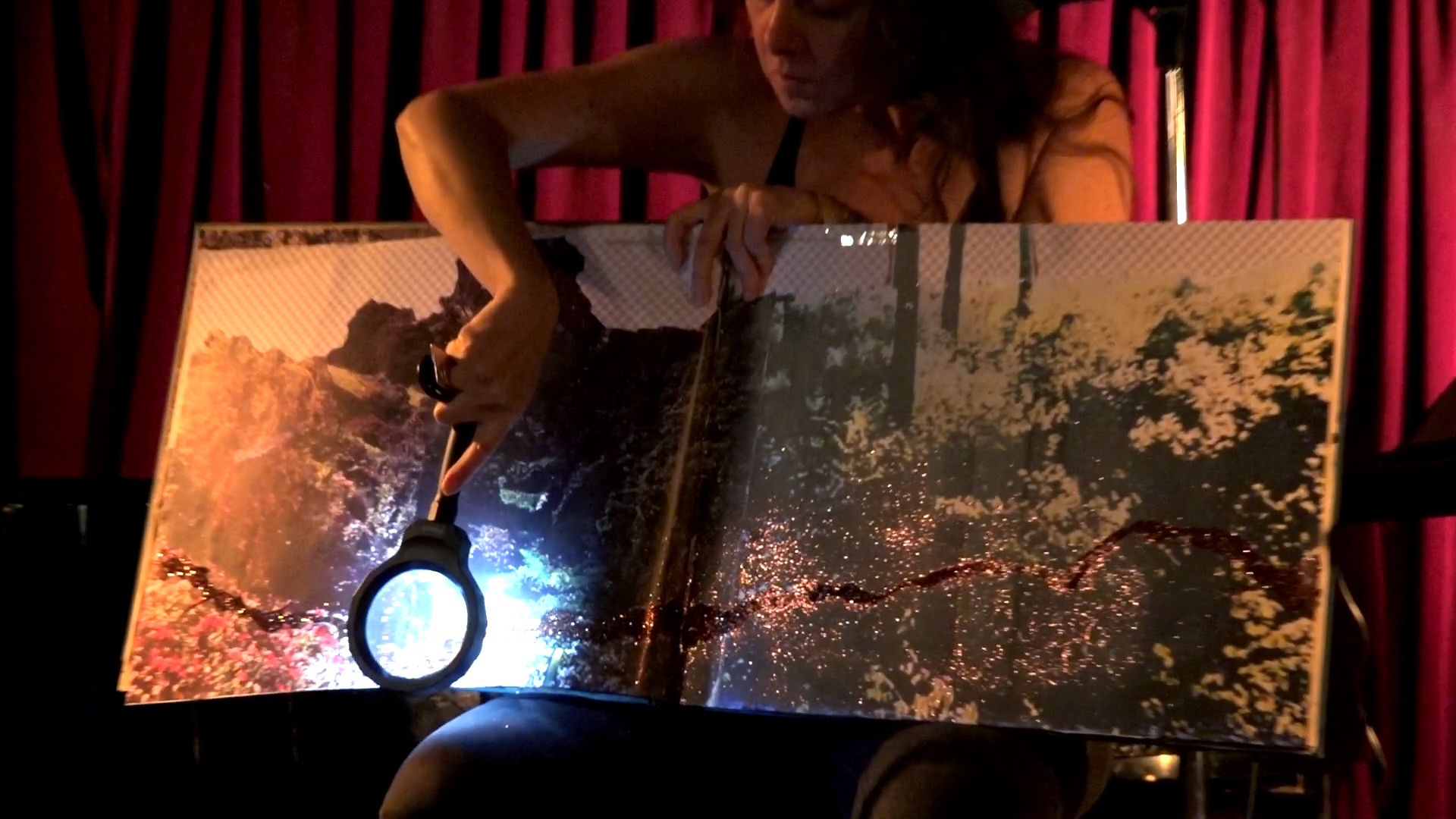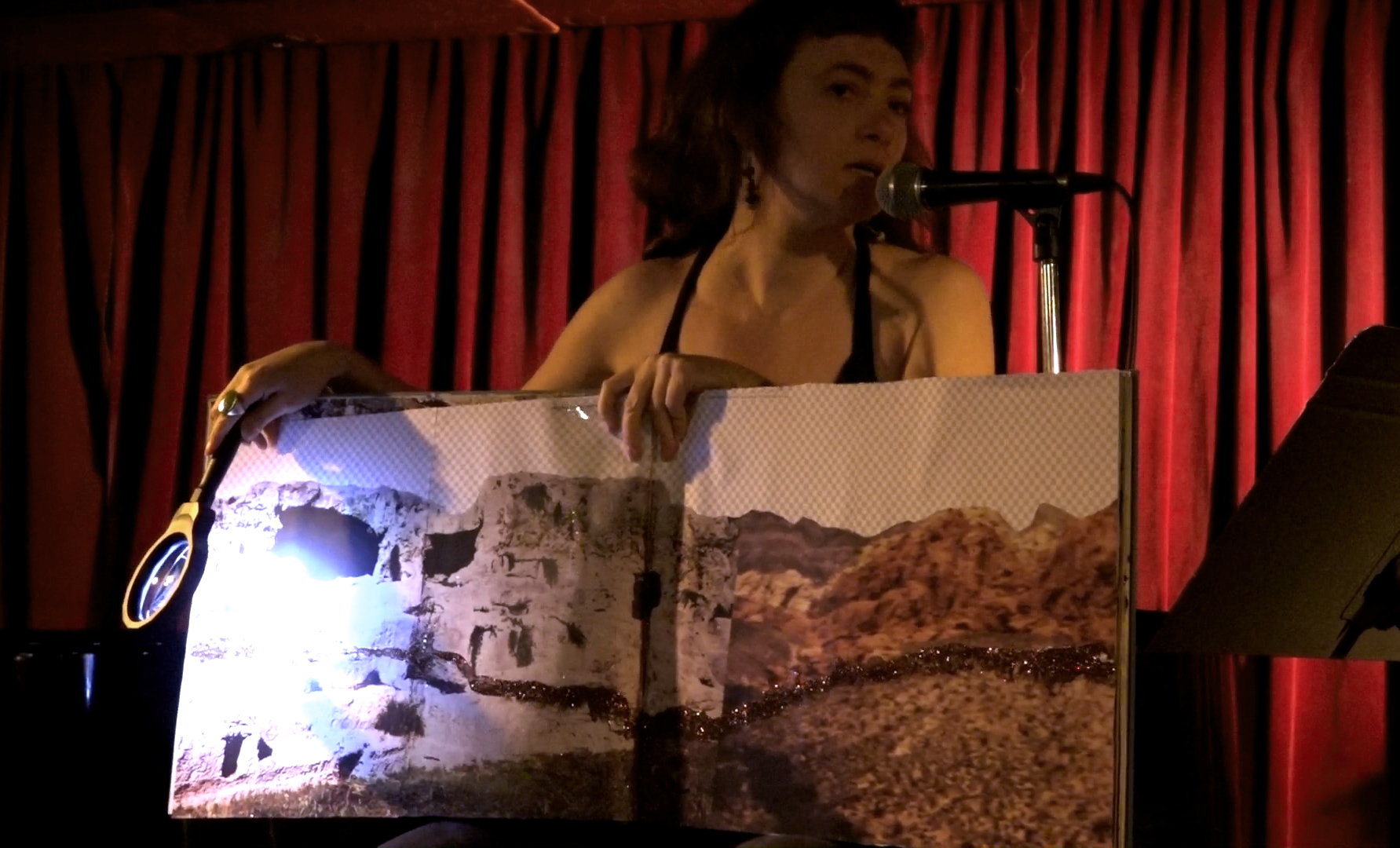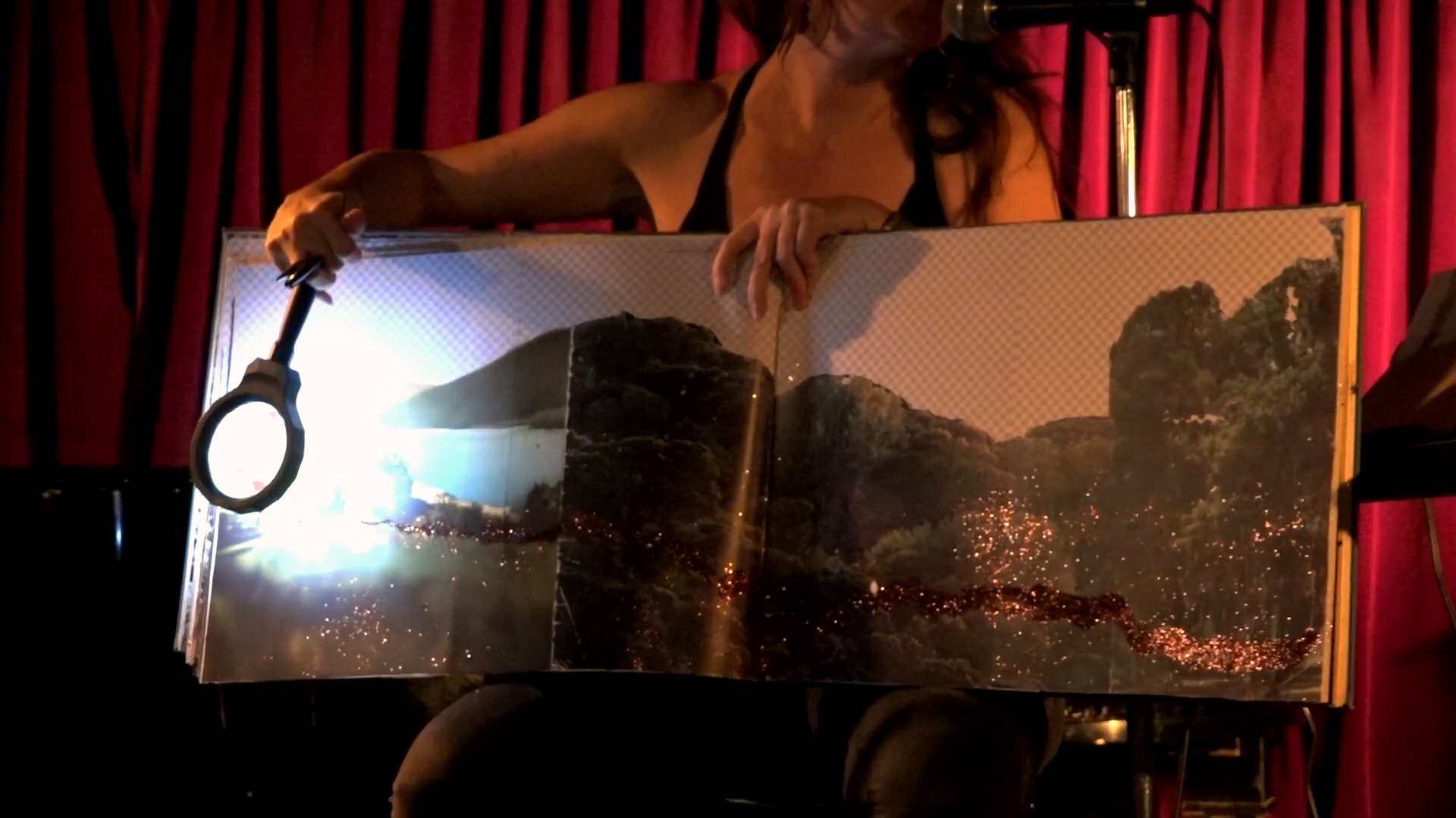 With a lighted magnifying glass, I illuminate the line of brown glitter that runs through the landscapes on each page of my book. I read a bit of my poem, I turn the page, and repeat: