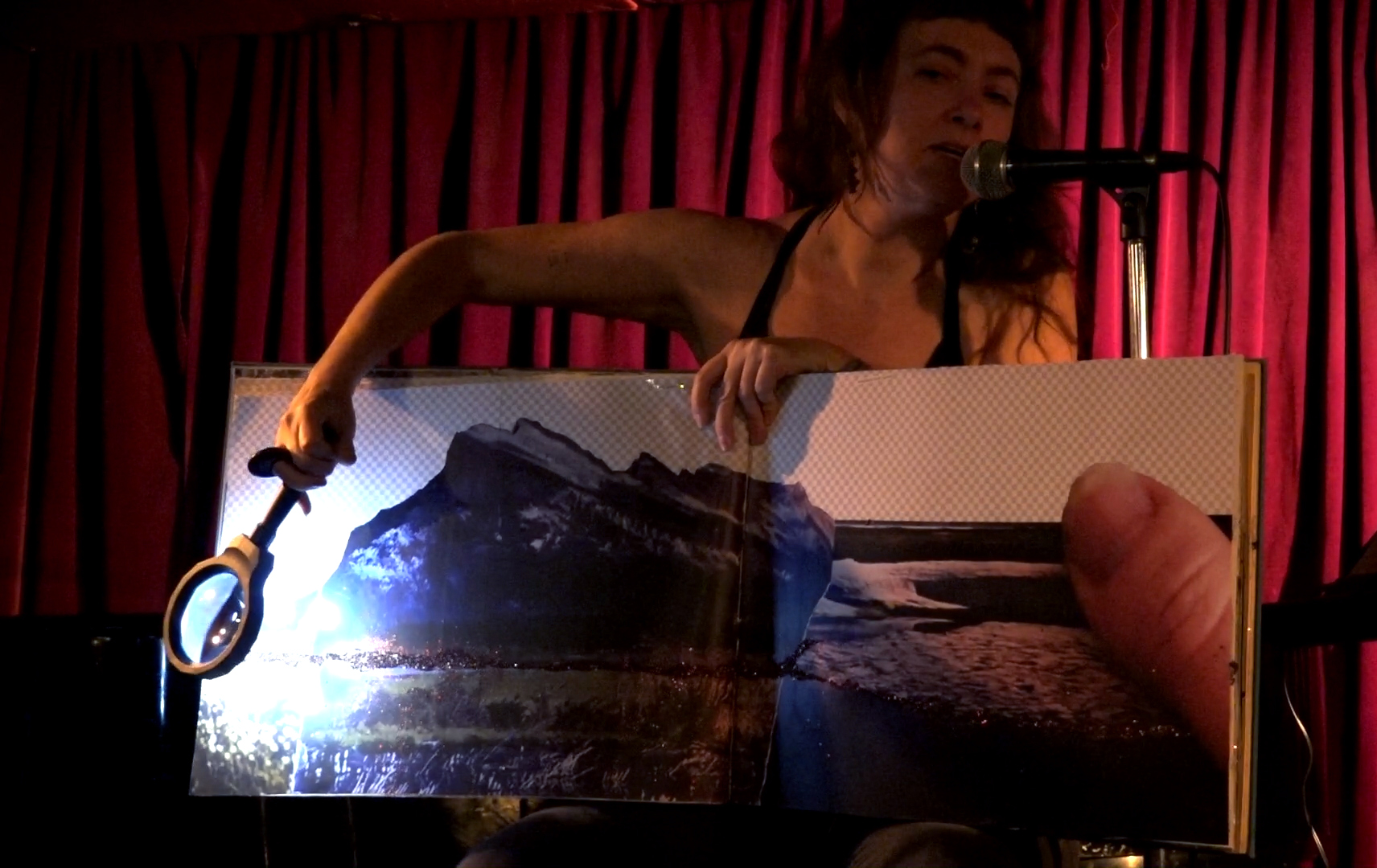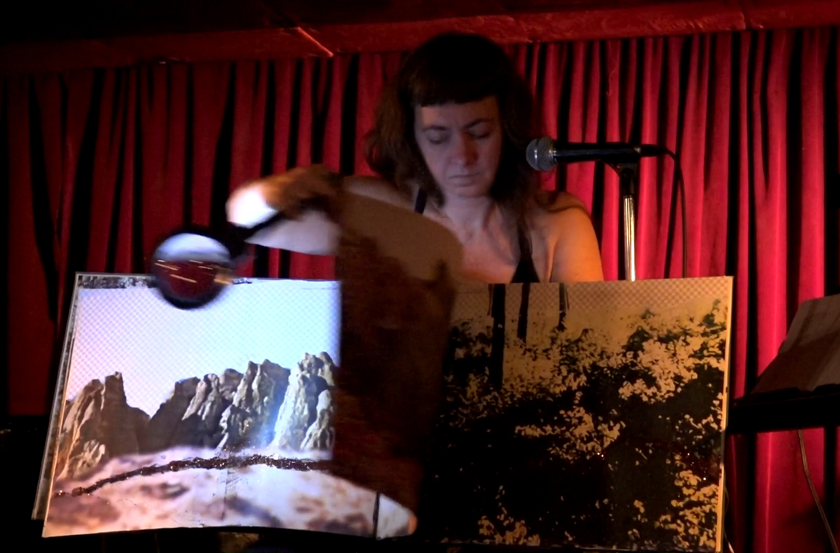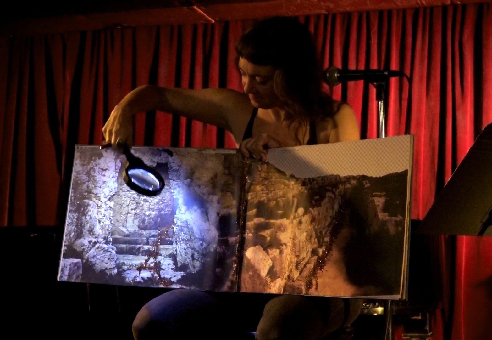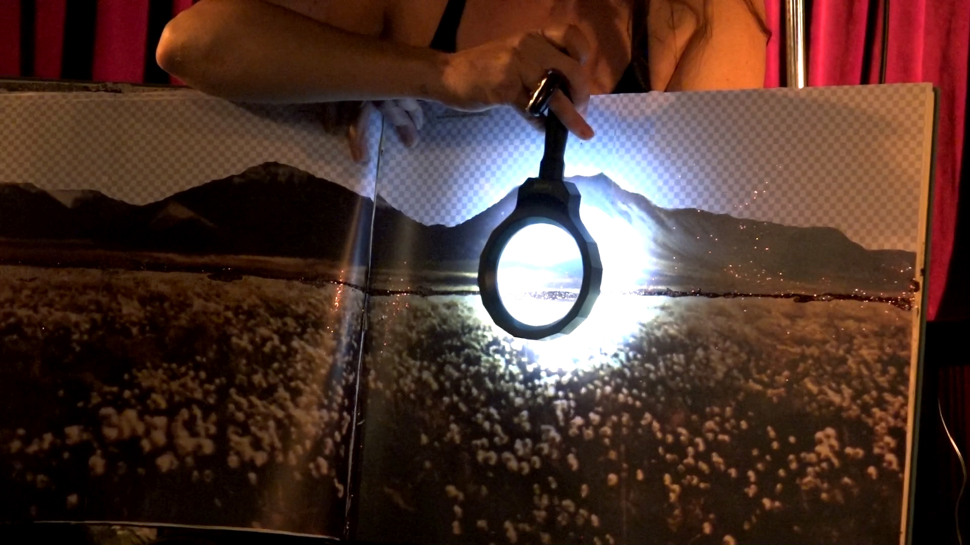 With a lighted magnifying glass, I illuminate the line of brown glitter that runs through the landscapes on each page of my book. I read a bit of my poem, I turn the page, and repeat: